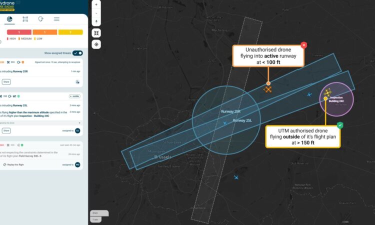 Key capabilities include 3D airport threat zones aligned with runways, approach paths and critical operational areas; dynamic runway configuration reflecting real-time airport operations; ATM and UTM integration for unified awareness across crewed and uncrewed traffic; multi-sensor integration combining RF, radar, camera and acoustic detection systems, and post-incident analysis and compliance reporting.