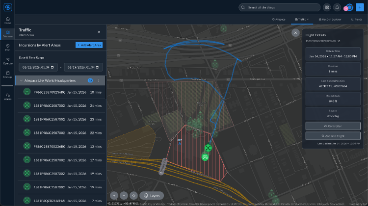 Alerts are triggered by live flight telemetry. When a drone enters an Alert Area, the system generates a notification once per detected flight per volume entry. The Alert Areas work across a growing range of sensor integration partners and can support customers deploying new or existing sensors onto the AirHub platform.